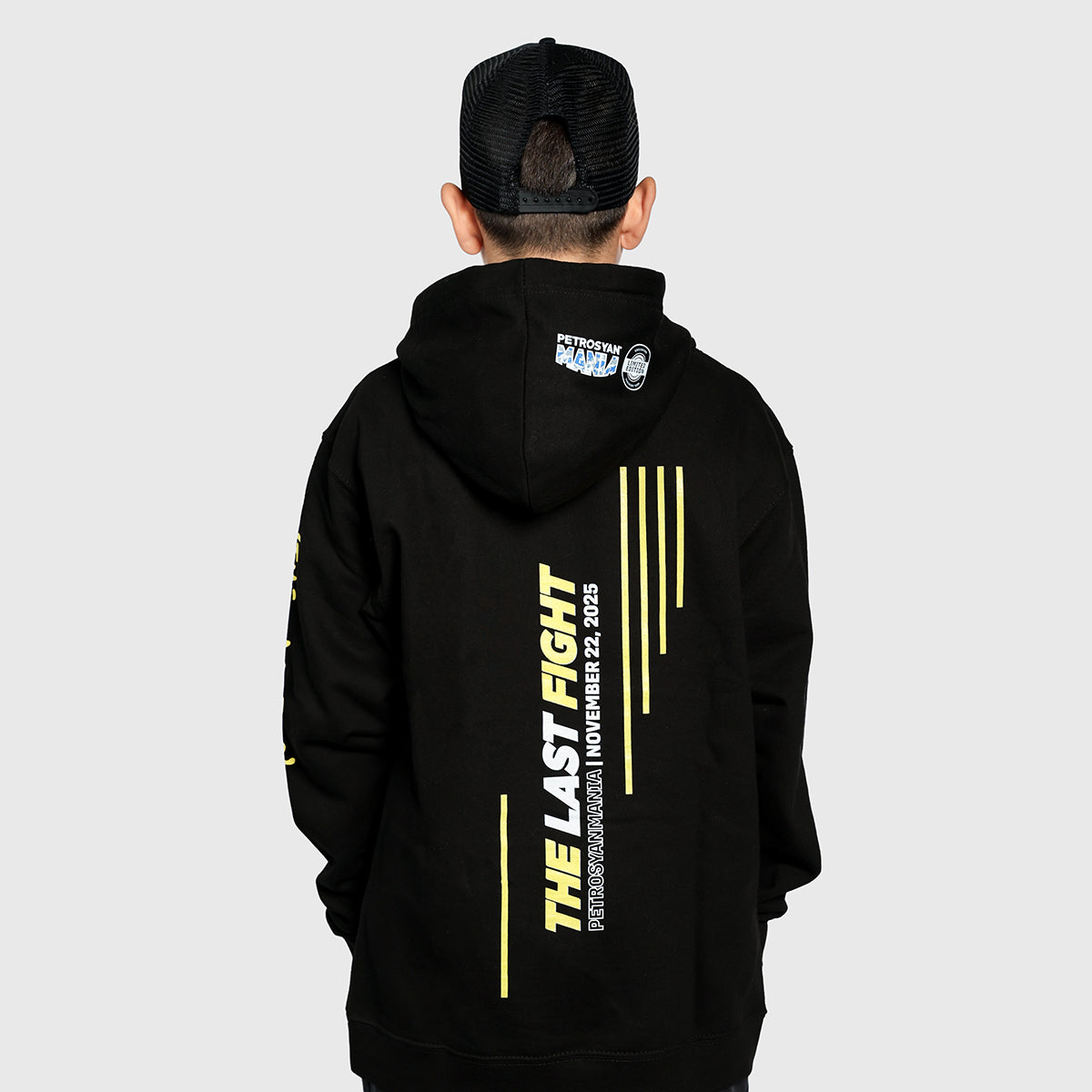 Felpa in edizione limitata con cappuccio, nera con logo di PetrosyanMania – The Last Fight, foto e firma di Giorgio Petrosyan. Disponibile in diverse taglie, adatta a uomini e donne.